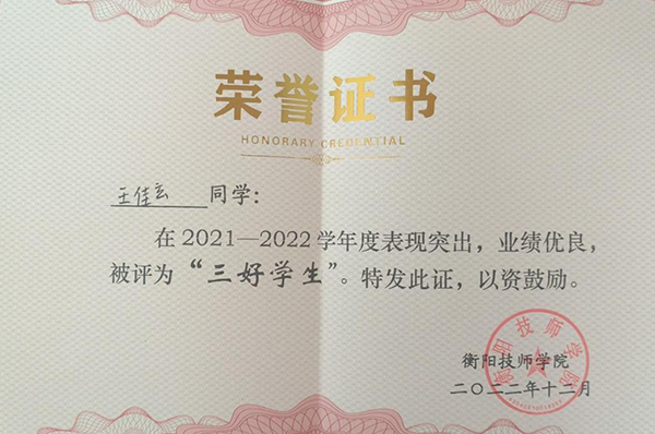 在學習的過程中,王佳玄遇到了許多困難和挑戰(zhàn)。但他從不放棄,而是堅持不懈地努力,逐漸成為班里的佼佼者。功夫不負有心人,王佳玄在來校的第二年就獲得“三好學生”等榮譽,2023年獲得國家獎學金,獲獎之后的他受到了莫大的鼓舞,看到了自己人生的新希望。這些榮譽不僅是對他學業(yè)的肯定,更是對他堅韌不拔精神的認可。