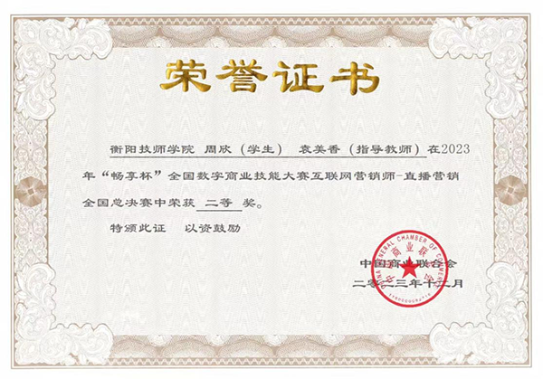 在技能競賽備賽期間,周欣常常刻苦勤奮,努力提升技能。在遇到瓶頸時,她虛心請教;在突破新方向時,及時與競賽班同學交流探討。一分耕耘一分收獲。在2023年“暢想杯”全國數字商業技能大賽互聯網營銷師——直播營銷全國總決賽中,最終成功獲得二等獎。