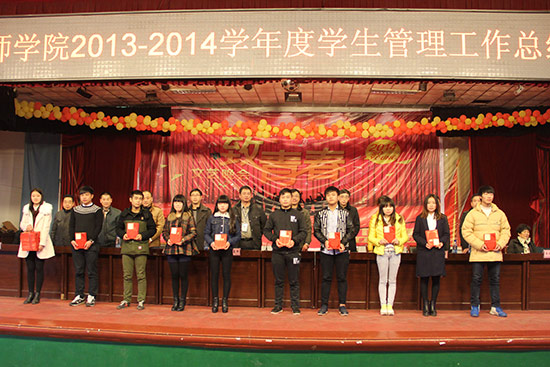 1月5日下午,衡陽技師學院2013-2014年度學生管理工作表彰大會在學院大禮堂隆重召開。唐和平副院長出席了大會,各系黨總支書記、全體學管人員、學生代表共同參加了大會。大會由學生處處長周孝漢主持。