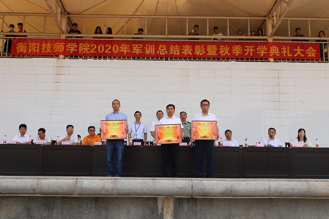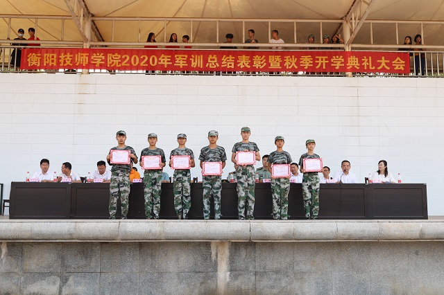 副院長廖與飛宣讀了2020級新生軍訓工作的各項評比表彰決定,主席臺就座的領導為受表彰先進集體和個人進行了現場頒獎。