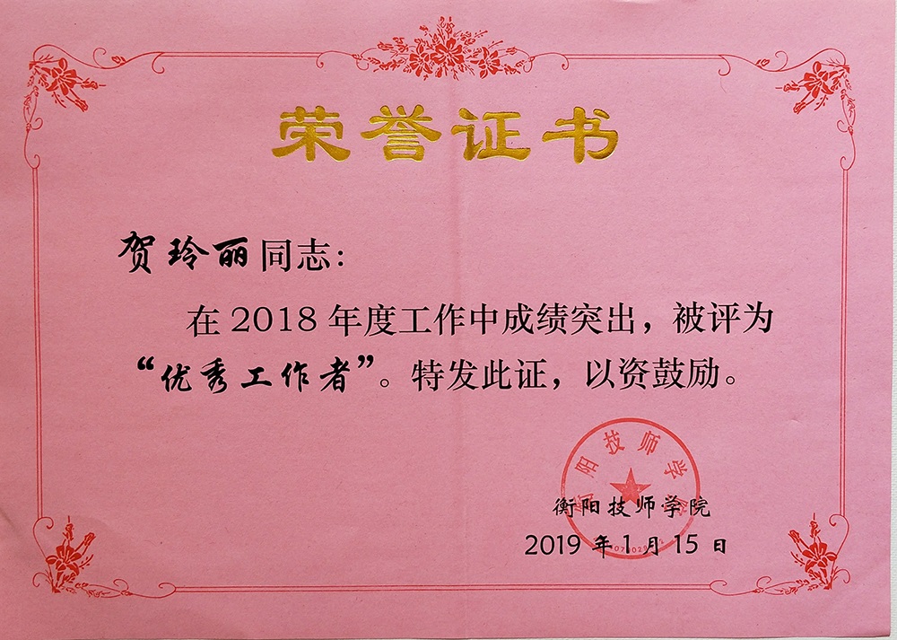 由于2018年度中賀玲麗老師工作成績突出,被衡陽技師學院評為了“優(yōu)秀工作者”稱號