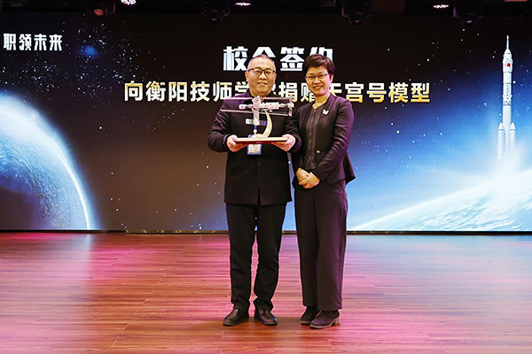 活動伊始,全體人員觀看了航天主題宣傳視頻,回顧我國航天事業(yè)的輝煌成就?,F(xiàn)場,學(xué)院與上海銀領(lǐng)智造科技有限公司簽署校企合作協(xié)議,周少良與企業(yè)代表王紅峰共同簽約,王瀾代表學(xué)院接受企業(yè)捐贈的“天宮號”模型。